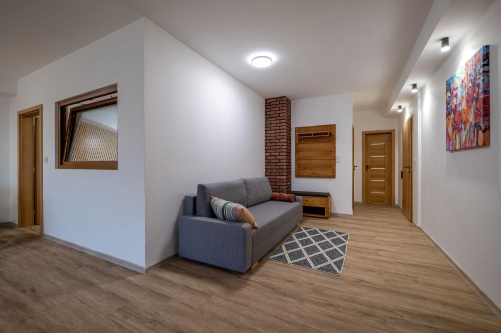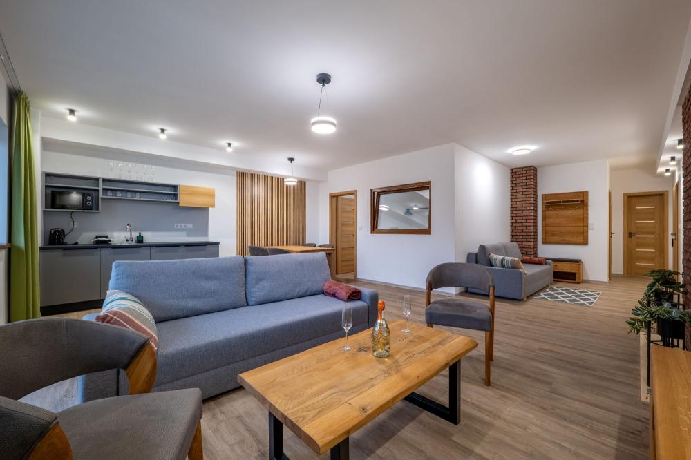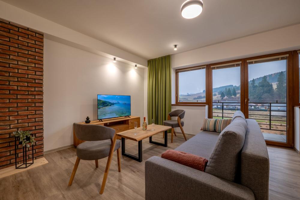 Užite si priestranný apartmán s krásnym výhľadom na wellness a okolitú prírodu. Ideálna voľba pre páry, rodiny aj skupiny, ktoré hľadajú pohodlie, súkromie a moderný interiér v príjemnej atmosfére resortu Dovalovec.