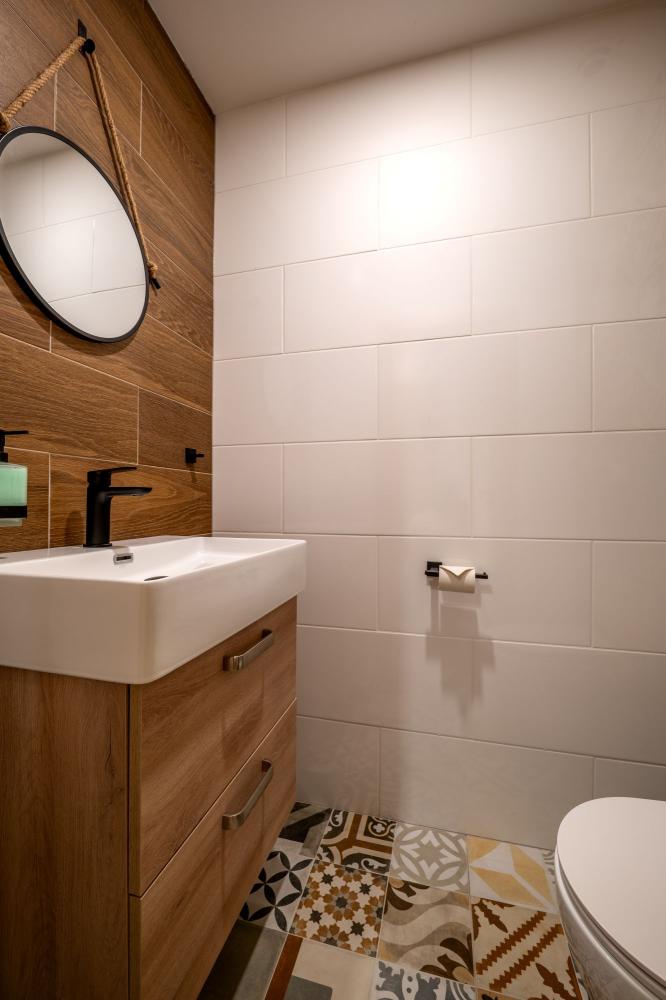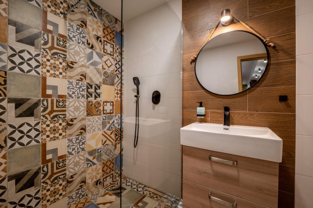 Kúpeľňa je moderne riešená, s walk-in sprchovým kútom, výraznými dizajnovými obkladmi a kvalitnými batériami. Samostatné WC dopĺňa komfort pre väčšie skupiny hostí. Apartmán poskytuje ideálnu kombináciu pohodlia, štýlu a funkčnosti — skrátka priestor, v ktorom sa budete cítiť ako doma.